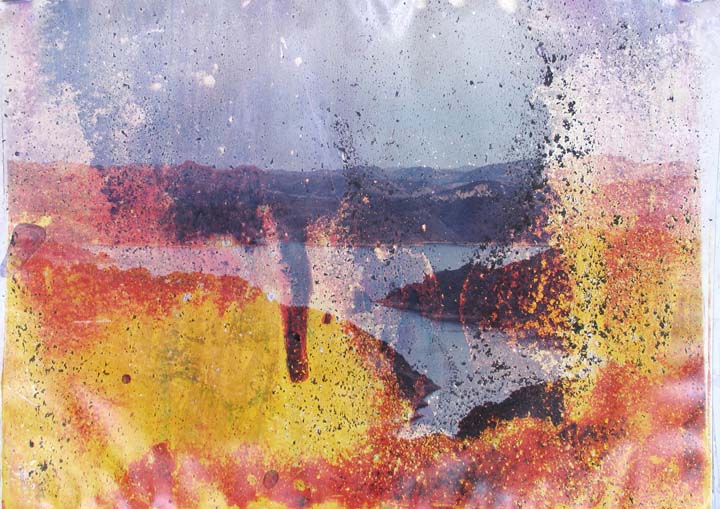 In his series, Lakes and Reservoirs, seen at AIPAD and the Armory Show, the impact of these images—depictions of Western landscapes, colorful images distressed through various means both manual and digital—was primarily of a landscape under siege. About the conceptual nature of his practice, which sometimes seems at odds with his choice of subject and setting, he wrote,