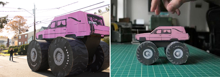life-size "truck hearse" out of paper and cardboard (below left), and … Read the full Story >>